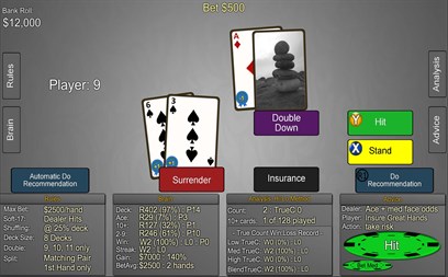 The Automatic AI system, created by a MIT recognized gambling algorithm innovator, adds even more value. Serving as the Brain of the Game, The Blackjack Wiz's AI system provides all the stats and facts you need to win. With Do Automatic AI, you can test out your game play strategies over hundreds (or thousands) of hands. Or, you can build your card counting skills via a variable speed Flash Card mode.