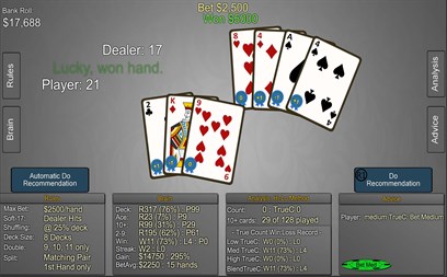 The Blackjack Wiz Casino Trainer for Windows is a real-world blackjack/21 game simulator and tutorial with on-screen artificial intelligence that gives the what, why and how along with all the rules, statistics, analysis and advice you need to take your game to the next level.