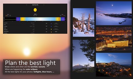 - Know the sun, when it rises and sets; the best hours to take photos. - Control the night. Moonrise and moonsets. Moon exposure times and starlight. Know the best night for taking photos of the auroras and the milkyway. - Plan your photos before going to any place. View in 2d or in amazing 3d. Landscapes, cityscapes, whatever you want. - Know all the photographic ephemeries of the year. - Master the camera with all the exposure and filters utilities - Master the depth of field and the hyperfocal - And much more...