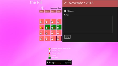 This App allows you to see days when you need to take your pill, start a new packet and see the date of your next menstruation. You can also set a reminder to the desired time for each day you need to take your pill so you do not forget. The calendar allows you to plan several months in advance when you should have your menstruation and what days you should take your pill. The application can be set according to the number of pills per packet, 21-day or 28-day pack, which can be adapted to all brands. Note the days you have take your pill.