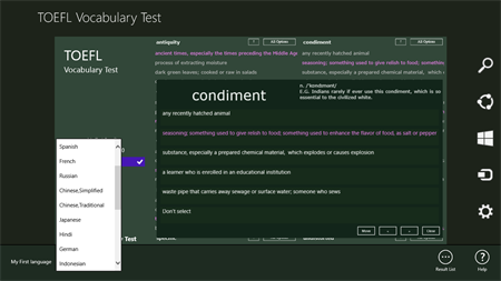 Is there any difference among this Windows 8 Store version and other versions? All versions of TOEFL Vocabulary Test from www.examword.com share same word bank. We commonly update word bank and its definitions per year, but cannot update all versions at same day, so at particular period tiny difference possibly is among these versions. As for software features, separate versions have different merits based on the natures of various devices, users can select on demand.