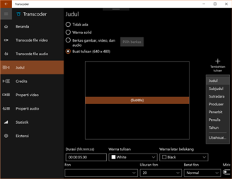 Dengan mudah mengkonversi berkas audio dan video dari format satu ke format lainnya. Format Sumber: .mov, .mp4, .wmv, .avi, .wma, .mp3, .m4a, .wav, .flac Format Tujuan: .mp4, .wmv, .avi, .wma, .mp3, .m4a, .wav Tambahkan judul dari gambar, video, atau audio Tambahkan judul dengan gambar, video, atau audio Tambahkan judul berdasarkan metadata berkas media (seperti judul, subjudul, penerbit, dsb.)
