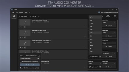 Convert TTA audio to MP3, TTA to WAV. Convert TTA to AAC, OGG, FLAC, M4A, M4B, CAF, WAV, AIFF, WMA, AC3, MP2. ???? Convert multiple files at once, there's no limit to how many files. ???? All processing is performed locally on your computer where your files remain safe and private.