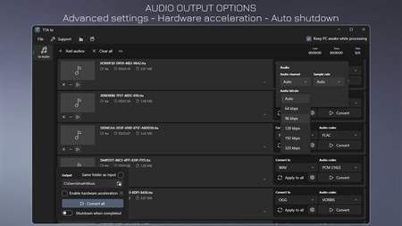 • Enable hardware acceleration to save time. • Auto shutdown when completed. • Save time with multiple files processed at once or focusing on a single audio.