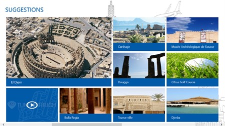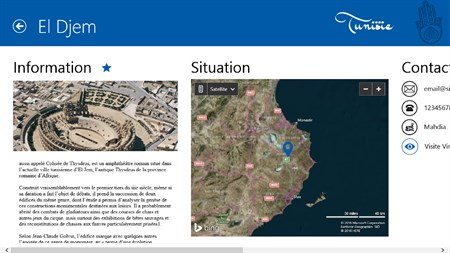 Découvrez les plus beaux sites de la TUNISIE entière à visiter , "TUNISIA TOUCH" permet d'afficher, sur une carte, des ressources géo-localisées, lieux touristiques très connus, qui contiennent des informations pouvant être en plusieurs langues, des images, des vidéos, et des routes appropriées géo-positionnées. Elle permet aussi de naviguer dans un lieu touristique en expérimentant des visites virtuelles 360° avec interactivité gestuelle.