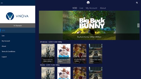 The V-Nova app provides a variety of example MPEG-5 Part 2 LCEVC-enhanced H.264/AVC video streams for both Live and VOD content. Watch the streams to see the higher quality achievable at low bitrates. The content has been encoded by the V-Nova Platform and users can also use the app to play back their own content encoded on the platform if you have signed up for an account at platform.v-nova.com.