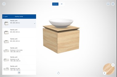 App functions: - The app starts in Catalogue Mode, which allows you to explore all the products without further aids. - Use the menu at the bottom left to select different products. - Use the ‘Back’ button in the product menu to conveniently navigate between product groups and collections. - For many products, the colour can be changed using hotspots and the colour selection menu on the right. - Use the info hotspot to learn more about selected products, such as DirectFlush.