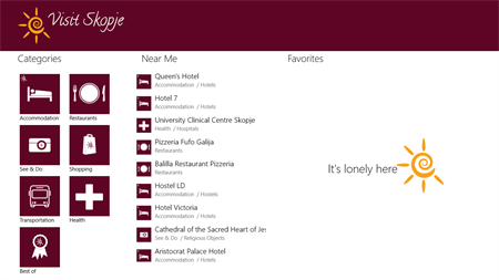 Useful app for all the visitors of Skopje. Find a hotel or hostel, restaurant, a place for shopping or find information about the historical heritage, monuments, nature beauties … Features: - Location and map for finding the desired place easier - Summary of the closest places around you - Adding favorites - Weather forecast
