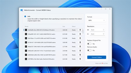 WebmConverter is a versatile Windows app designed to convert WEBM videos to various popular video formats effortlessly. With WebmConverter, you can convert your WEBM videos to formats such as MP4, AVI, MKV, and more, ensuring compatibility with a wide range of devices, media players, and online platforms. Whether you need to share videos with friends, upload them to websites, or edit them in applications that don't support the WEBM format, WebmConverter provides a user-friendly interface and efficient conversion capabilities. Simplify the process of converting WEBM videos with WebmConverter - the ultimate WEBM video converter.
