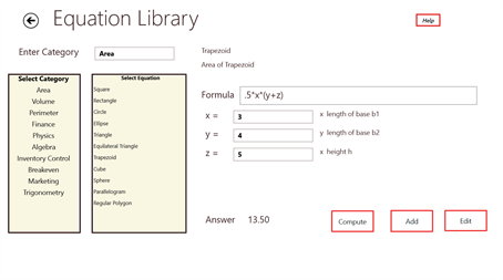 This is the only calculator developed that has a built in equation library of 80 functions. You can look the equations up by category , enter your data and see the answer in seconds. You can even add , edit and save your own equations to the library. It is the only one of its kind.