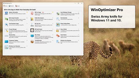 QR Code Creator: Create QR Code for text, link, email, Whatsapp, SMS, Call, Wifi. Bulk Image Converter: Convert multiple images to another format (jpg, png, heic, tiff, webp, or PDF). Auto Wallpaper Changer: Updates your background every day or hour with beautiful images from Bing or NASA. Find Duplicate: Find and remove duplicate files. Find Duplicate Images: Find and remove duplicate image files. Folder Size Analyzer: Determine which files or folders are taking up your hard drive space. My Tray Icon: A special tray icon helps you quickly access Windows settings. Process Manager: View detailed information about all running processes and change priority levels for specified processes. Secure Delete: Completely and securely delete sensitive files from your hard drive. Shortcut Keys: Create keyboard shortcuts for quickly opening apps, folders, or websites. System Information: Show detailed information about your system. Track Cleaner: Protect your privacy by eliminating traces of your digital activities. Transparent Taskbar: Make your Windows Taskbar completely transparent. Troubleshooter: Fix problem with Internet connection, icon, thumbnail, and Microsoft Store.