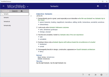 The WordWeb English dictionary and thesaurus: fast searching, spelling suggestions, definitions, usage examples, synonyms, related words - and no adverts.