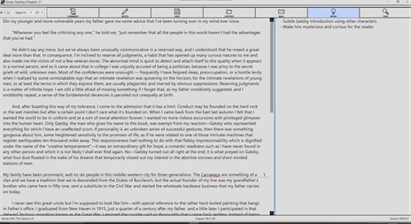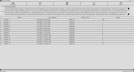 Features: - Daily Word-Count Analysis, Chapter Based Reading and Writing Times shown graphically giving useful insight into writers habits and progress. - Eliminates distraction organizing Summary and Notes in the same window without leaving the application. - Provides session time and word count for every session to provide immediate progress feedback. - Publishes to Word Document ready to be sent to Publishers/Agents/Clients. - Backs-up at every save to provide security from losing data. - Email feature allows users to send themselves their work in plain-text and word document.