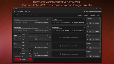 Convert XPM, XBM images to PNG/PNG8, JPG/JPEG, GIF, BMP, ICO, WEBP, PBM, PCX, WBMP. ???? Convert multiple files at once, there's no limit to how many files. ???? All processing is performed locally on your computer where your files remain safe and private.