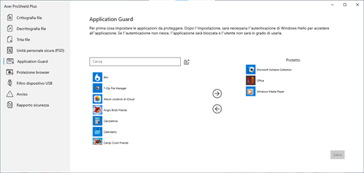 Application Guard Impostare le applicazioni da proteggere. Dopo l'impostazione, sarà necessaria l'autenticazione di Windows Hello per accedere all'applicazione. Se l'autenticazione non riesce, l'applicazione sarà bloccata e l'utente non sarà in grado di usarla.