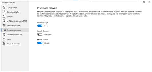 Protezione browser Impostare i browser da proteggere. Dopo l'impostazione, sarà necessaria l'autenticazione di Windows Hello per accedere al browser. Se l'autenticazione non riesce, Edge non sarà in grado di accedere. Chrome e Firefox accederanno come guest e le informazioni utente pertinenti saranno crittografate e protette, come i segnalibri, ID, password e altro.