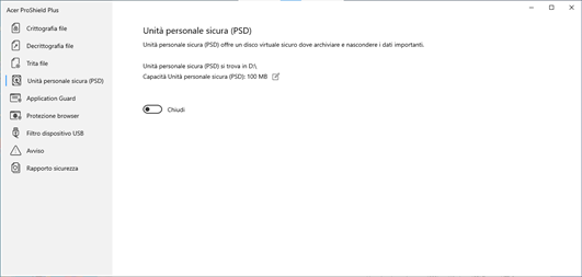 Unità personale sicura L''Unità personale sicura (PSD) è una sezione sicura del proprio disco rigido nella quale è possibile salvare e nascondere i file importanti.