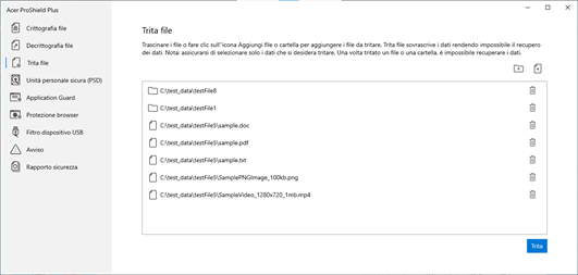 Trita file Da qui è possibile selezionare i file da rimuovere completamente dal disco rigido. Il Trita file sovrascrive i dati rendendone impossibile il ripristino. Assicurarsi di selezionare solo le informazioni che si desidera tritare. Una volta tritato un file o una cartella, è impossibile recuperare i dati.