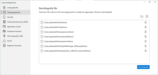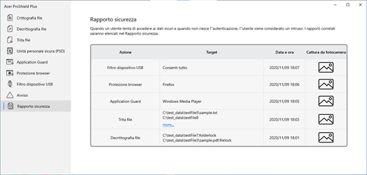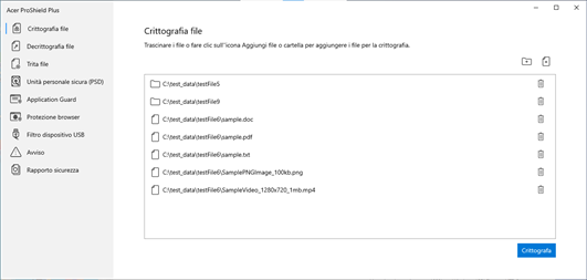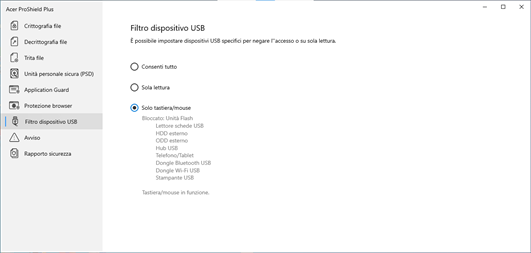 Acer ProShield Plus comprende dei moduli che proteggono il dispositivo dagli accessi non autorizzati e dalle intrusioni. ● Crittografia file ● Trita file ● Unità personale sicura (PSD) ● Application Guard ● Browser Guard ● USB Device Filter