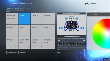 Con l'app di configurazione Afterglow si possono regolare l'illuminazione, i livelli di vibrazione e i volantini multifunzione del controller prismatico Afterglow per Xbox One*. Accertati di avere sempre installato il firmware più recente sul controller con gli aggiornamenti scaricabili forniti attraverso l'app. Inizia creando dei profili per i tuoi giochi preferiti e accedi ai profili salvati sul cloud per usarli in futuro. Sfrutta un modo visivamente accattivante per regolare e salvare le impostazioni del controller prismatico Afterglow.
