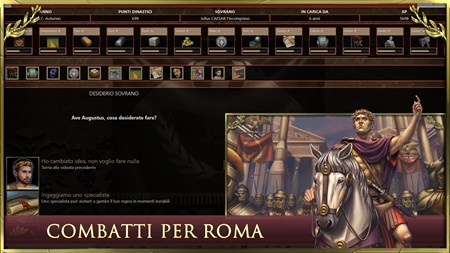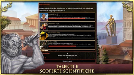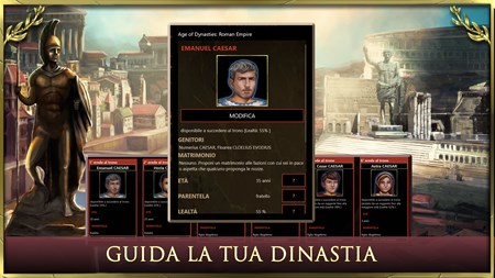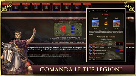 Age of Dinastie: Impero Romano, caratteristiche: - gioco di strategia a turni: applica le giuste strategie per amministrare al meglio il tuo impero ripercorrendo, ad ogni turno di gioco, gli eventi storici più significativi della storia di Roma. - dinastia e talenti: fai prosperare la tua dinastia al comando del tuo impero ed evita l'instaurazione della Repubblica romana. Educa i tuoi eredi scegliendo con strategia e tattica i talenti per addestrare il futuro imperium ad essere un grande conquistatore e leggendario imperatore. - gestione delle città: fai crescere le tue città edificando fori imperiali, anfiteatri romani, acquedotti, pantheon dedicati alle divinità romane, ville imperiali e fortificazioni. - simulatore di battaglie: assumi il comando dei tuoi eserciti nell'antica Europa in epiche battaglie. Guidali con strategia e tattica militare per soggiogare le civiltà avversarie e conquistare i territori. - investi in tecnologie e scoperte per potenziare l’esercito ed accelerare la conquista. - gioco di conquista: guida le legioni per partecipare alle guerre puniche, alla rivolta di Spartaco, alla conquista della Gallia, alle guerre civili ed alla conquista di territori. Vivi l'ascesa e la gloria di Roma! - ufficiali e carriera: arruola fidati centurioni e generali a cui assegnare la strategia ed il comando delle tue legioni. Circondati di capaci senatori ed ufficiali per amministrare con tattica le province romane. - alleanze ed intrighi politici: proponi matrimoni reali, alleanze o accordi commerciali alle civiltà che controllano i territori confinanti l’impero o dichiara loro guerra ed invia le tue legioni a conquistare i territori. Affronta il potente impero di Cartagine, le tribù dei Galli, l’eterno impero egiziano e molte altre civiltà vissute all’epoca di Roma. - innovativo gioco di strategia e tattica nell’antica Roma. Age of Dynasties miscela perfettamente quattro tipologie di gioco: guerre tra civiltà e giochi di conquista, strategia a turni, giochi gestionali, GDR.