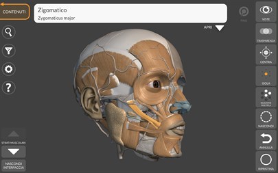 INTERFACCIA SEMPLICE E INTUITIVA • Ruota e ingrandisci ogni modello nello spazio 3D • Divisione per regioni per una visualizzazione chiara e immediata di ogni struttura • I muscoli sono raggruppati in strati, da quelli superficiali ai più profondi • Visualizzazione degli strati muscolari in modalità multipla o singola • Possibilità di nascondere ogni singolo osso o muscolo • Funzione Filtro per nascondere o visualizzare ogni sistema • Rotazione Intelligente, sposta automaticamente il centro di rotazione per una navigazione più facile • Pin interattivi permettono di visualizzare il termine relativo ad ogni dettaglio anatomico • Nascondi /Mostra interfaccia, ideale per l'utilizzo su smartphone • Descrizioni dei muscoli (origine, inserzione, azione), in inglese