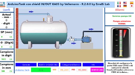 Arduino Tank, utilizzando Arduino UNO Rev.3, la scheda I/O KA05/VMA05 ed un sensore ad ultrasuoni con uscita analogica ( 0-5 Vcc ), controlla il livello di un liquido all'interno di un serbatoio, attivando una pompa di svuotamento a raggiungimento di un set point impostato. I valori di livello indicati sono espressi in mm.