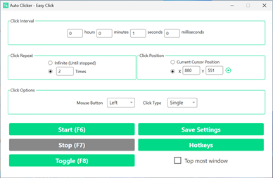 2. Customizable Settings ⚙️ Tailor your clicking experience to perfection. You can set the clicking interval and specify the number of clicks you need. This flexibility ensures that you get the job done exactly how you want it.