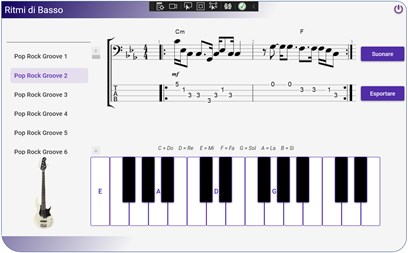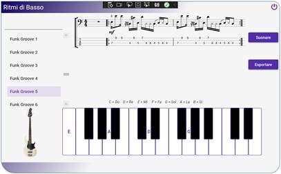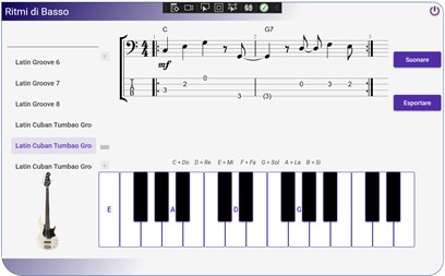 L'applicazione Ritmi di basso riunisce una raccolta di ritmi di basso molto interessanti. Sono inclusi molti stili musicali come pop, rock, blues con linee di basso ambulante, funk con ritmi di basso slap, musica latina con ritmi afro-cubani, mambo, songo, son montuno e ritmi di basso sordina. Dall'applicazione è possibile: * Vedi ogni linea di basso come una notazione in tablatura * Suona ritmi * Esporta ritmi in formato .midi per l'uso nel tuo postazione audio digitale preferito o software di notazione musicale * Suona i tuoi groove di basso su una tastiera virtuale a bassa latenza con suoni di bassi ultra realistici.