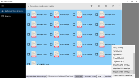 Convertitore di formati video batch. Una varietà di conversione di formato video. Supporto MP4, WMV, conversione di formato AVI. Conversione di risoluzione differente: conversione HD1080p, HD720p, 480p, 360p, 240p, Ntsc, Pal, Vga, Wvga, Qvga, è possibile personalizzare anche la risoluzione di conversione. Formato di conversione personalizzato: è possibile personalizzare completamente la dimensione video target, il bit rate, la frequenza fotogrammi e altri parametri. Utilizzare questo software, è possibile comprimere il video, un file video per ridurre la comodità della trasmissione Internet. Non è possibile anche un video ad alta definizione in alta definizione (1080p).