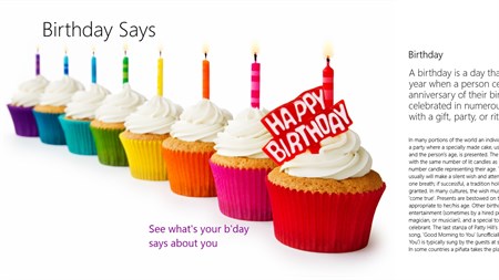 The beautiful and sleek designed Birthday Says elaborates the rich features about your birthday with new mouthwatering cakes photographs every week. Just with little taps you'll get to know what's your birthday actually says about you. So, enjoy with your family and friends.
