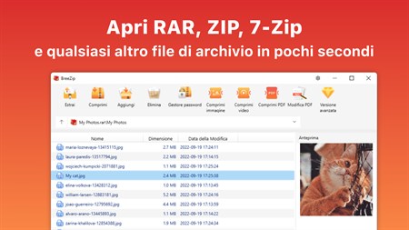 BreeZip è uno strumento per "decomprimere" molti tipi diversi di file di archivio - un'alternativa a WinRAR su Windows 10 e Windows 11. BreeZip renderà facile decomprimere e scompattare rapidamente i file di archivio. Aprirà formati comuni come ZIP, RAR, 7-Zip, TAR, Gzip e altro ancora. [Caratteristiche distintive] • Apri, sfoglia, visualizza ed estrai file di archivio • La funzione di decompressione supporta diversi formati: .rar, .zip, .7z, ISO, Bzip2, Gzip, TAR, XZ, ecc. • Crea archivi facilmente con la GUI come l'esplora file. • Crea archivi protetti da password. • Apri RAR e converti rar in formato zip. • Quando un archivio viene aperto in BreeZip, ne vengono visualizzati i contenuti. È quindi possibile selezionare i file e le cartelle da estrarre. [Premium: funzioni degli acquisti in-app] • Ripara archivio corrotto • Anteprima foto senza estrazione • Gestisci facilmente le password dell'archivio per essere libero da quelle complesse • Comprimi video, immagini e PDF • Editor PDF e Office integrato con esperienza unica • Libera spazio e ottimizza lo storage • Nessuna pubblicità • Fino a 10 dispositivi Piano di abbonamento: fatturato annualmente a $4.99/anno Licenza a vita: acquisto una tantum per $9.99