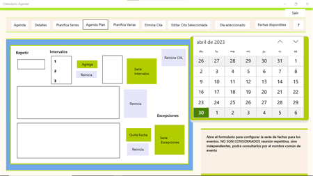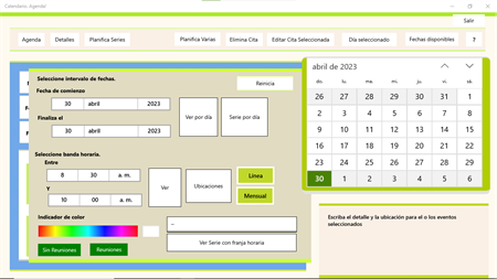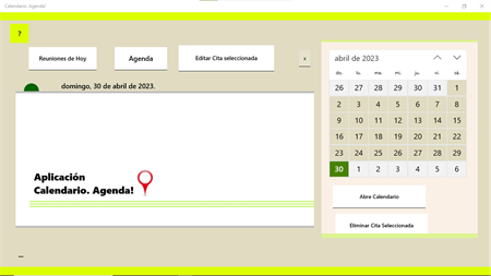 Agenda, allows you to enter the application. You can check available dates, plan and schedule appointments, series. You will be able to work with appointment's details and location! Ask for locations Via calendar maps, get complete lists and by keyword. You will be able to ask for list of meetings of a certain date and edit appointments through the Windows Calendar interface. You will be able to edit an entire day through the Windows calendar interface View LISTS AND GRAPHICS (time lines) daily, monthly complete and by keyword, etc.