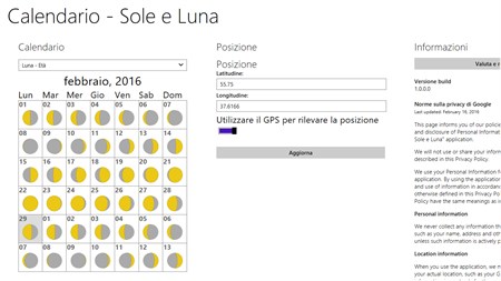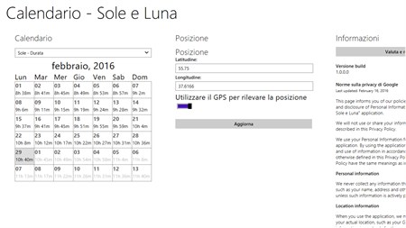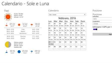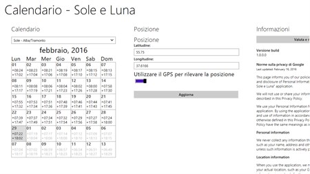 Caratteristiche: * Determinazione della posizione delle stelle in un dato punto nel tempo corrente (area geografica, altezza sull'orizzonte) * Alba Timing e il tramonto, mezzogiorno astronomico, così come lunghezza del giorno * Tempi di alba e tramonto, la luna, e nel momento in cui passa attraverso il punto più alto * Il calcolo delle fasce orarie per il crepuscolo civile, nautico e astronomico * Calcolo del momento ottimale per immagini - "oro" o l'ora "magia", "blu" ora * Definizione della posizione corrente (latitudine e longitudine), e la scelta di qualsiasi posto sulla mappa * I dati previsionali sul sole e la luna sulla griglia del calendario su un mese arbitrario * Fasi di previsione della luna (luna nuova, luna piena, luna crescente, nel primo trimestre, ecc), la sua illuminazione * Nel corso della prossima luna piena, luna nuova