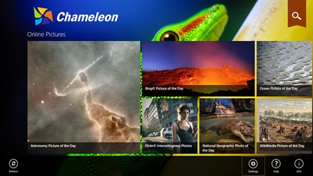 Chameleon v3.0 released, start to support change Windows desktop wallpaper. Please go to http://chameapp.azurewebsites.net/chamedesk/chamedesk_setup.exe to download desktop tool to enable this feature. **************************** Chameleon comes from a quite simple idea – bring a little more comfort every time when your Windows 8.1 is started or locked. How does it make that happen? First, it keeps watching the online services such as “photo of the day”, “image search” and “photo sharing” around the world, and also your local collections. Then, you can make Chameleon change the background picture of your lock screen in every 15mins, 30mins, 1hour etc.