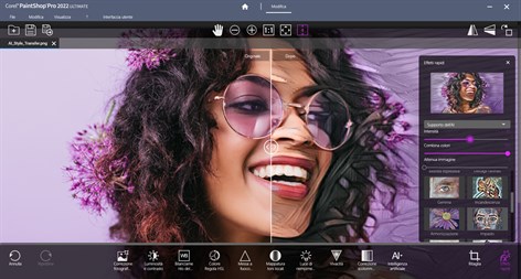 Soluzioni intelligenti - Modifica o sfoca gli sfondi con la tecnologia di intelligenza artificiale - Ingrandisci un'immagine con l’Upsampling AI - Crea immagini stilizzate con il Trasferimento stile AI - Elimina le imperfezioni o gli oggetti e riempi automaticamente le aree con strumenti sensibili al contenuto - Elimina l’effetto occhi rossi, le macchie e perfeziona l’incarnato con gli strumenti Trucco - Prova centinaia di effetti e impostazioni predefinite per ogni tipo di risultato immaginabile Compatibilità e flessibilità - Importa, salva ed esporta facilmente in una varietà di formati di file supportati, inclusi i file Photoshop PSD - Supporto delle versioni a 64 bit di plug-in terze parti, quali Topaz Labs, Nik Collection by DxO, Adobe e altro ancora. - Ottieni il supporto delle ultime tavolette grafiche più diffuse e compatibili WinTab per il disegno e la pittura - Accedi a contenuti di apprendimento, consigli e istruzioni direttamente dall’interno del programma