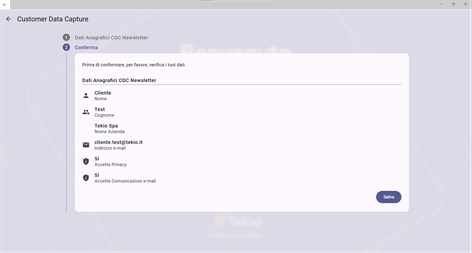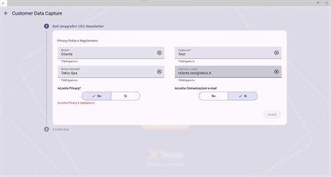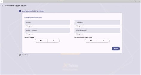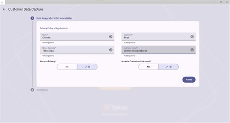 Vibecode CDC - Customer Data Capture Con il modulo CDC - Customer Data Capture – potrai raccogliere in maniera rapida e puntuale i dati del tuo cliente in ottica fidelizzazione. La soluzione è utilizzabile su tablet o terminale portatile, il cliente può registrarsi al tuo programma fedeltà in autonomia in negozio o in modalità assistita dall’operatore di vendita. Il modulo è semplice e completamente personalizzabile sia nell’interfaccia che nella funzionalità dei campi desiderati. Ottieni immediatamente benefici da questa App: - Completamente personalizzabile nei dati da richiedere ed estendibile con informazioni anagrafiche a piacere - Facilita l’adesione del cliente ai vostri programma fedeltà - Garanzia di dati corretti e congruenti grazie alle verifiche legate a procedure di double Opt-In - Gestione consensi SMS, Mail, cellulare e privacy policy - Possibili integrazioni con i principali sistemi CRM presenti sul mercato