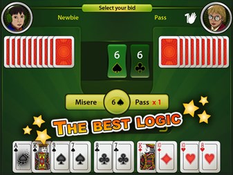 The game contains: - Six complexity levels. None of them (except Cheater) cheats: good gameplay is achieved only by thorough calculations; - Three most popular conventions (Leningrad, Sochi, Rostov) with ability to customize other Preferans conventions; - Journey with popular characters; - Tweaking UI (timeouts, animations, suit and card orders) and gameplay, in-app language selection; - User offers, discard returning, deal customization.