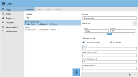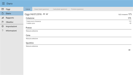 CARATTERISTICHE: 1. Un design semplice e potente: la app si apre direttamente sulla schermata di entrata della voce con il pasto più recente, perché questo è quello che userete più. Il design rende l'aggiunta di voci il più semplice e intuitivo possibile. 2. Una voce inserita tramite un tocco con suggerimenti personalizzati: I prodotti alimentari più comuni possono essere selezionati immediatamente. A partire dal secondo giorno, i vostri alimenti recenti saranno suggeriti perché è possibile mangiare lo stesso cibo frequentemente. 3. Il login non è necessario: I dati personali o informazioni di contatto non sono richieste. 4. Migliaia di alimenti già presenti nel database: la maggior parte dei prodotti alimentari hanno informazioni precise circa i comuni formati delle portate dai servire, calorie, carboidrati, proteine e grassi. 5. Supporto offline completo: non è necessario essere connessi a internet. 6. L'inserimento preciso dei dati è inoltre facile: È possibile immettere con precisione la quantità precisa utilizzando una funzione a scorrimento. 7. Rapporti giornalieri: usando il menù, è possibile aprire direttamente il diario, che mostra un sommario della tua giornata. Qui è possibile passare tra carboidrati, proteine e calorie premendo sul piccolo triangolo. 8. Tenere traccia dei vostri obiettivi: Dopo aver inserito i vostri obiettivi personali, è possibile utilizzare il rapporto della settimana per vedere le tendenze. 9. Promemoria personali per aiutarti a rimanere sull'obbiettivo: Essi sono un modo pratico per assicurarsi di compilare il diario, dopo ogni pasto o alla fine della giornata.