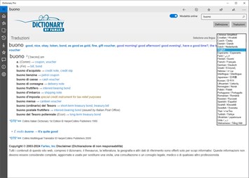 * Possibilità di scaricare dizionari estesi offline per altre 13 lingue: Italiano, Arabo, Cinese semplificato, Olandese, Francese, Tedesco, Greco, Norvegese, Polacco, Portoghese, Russo, Spagnolo, Turco.