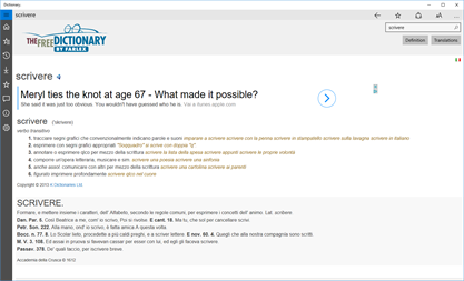 The Free Dictionary vi porta la potenza del più vasto dizionario del mondo! Inglese, Italiano, e altri 12 dizionari, tutto dalle fonti più accreditate. Traduci dall'inglese in più di 40 lingue e accedi ad dozzine di opzioni di traduzione. Leggi gli articoli postati quotidianamente, condividi persino le tue parole favorite tramite i social networks o le email.