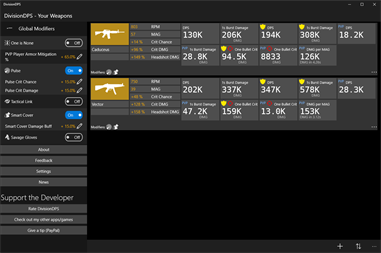 DivisionDPS is an unofficial companion app to "TOM CLANCY'S THE DIVISION" by Ubisoft. Calculate over 60 damage values per weapon, including PVP DPS, Boss DPS, Burst Damage against all enemies, Critical Hit Damage for body and headshots, damage per magazine and a lot more. Including damage buffs against elite enemies and enemy armor! Now you have all the tools and values to compare your weapons and decide which weapons fit your playstyle and which weapon is better in what situation.