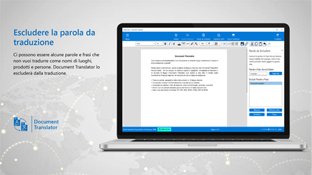 Escludere più parole o frasi dalla traduzione Ci possono essere determinate parole e frasi che non vuoi tradurre come nomi di luoghi, prodotti e persone. Puoi escludere queste parole dalla traduzione semplicemente aggiungendole alla lista. Inserisci la parola o la frase che desideri lasciare invariato. Basta aggiungerlo all'elenco e Document Translator lo escluderà dalla traduzione.