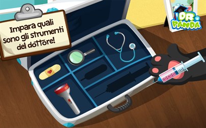 Non dimenticare di scegliere le apparecchiature mediche del Dr. Panda, molti trattamenti devono essere portati a termine: misura la pressione del sangue, applica la pomata, cura le ossa rotte, recupera gli elementi ingeriti, ridi mentre fai le iniezioni, mentre curi lo stomaco, gli occhi, le orecchie, la bocca ed i denti.