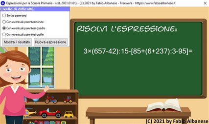 Un generatore di espressione aritmetiche utilizzabile su sistemi Windows pensato per la Scuola Primaria. Permette di selezionare il grado di complessità: – senza parentesi – con sole parentesi tonde – con parentesi tonde e quadre – con parentesi tonde, quadre e graffe Le espressioni generate utilizzano soltanto numeri naturali. E’ possibile visualizzare il risultato premendo l’apposito pulsante. Utilizzabile anche su LIM.