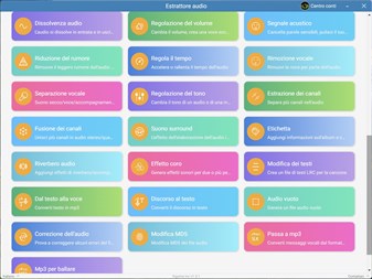 L'app include funzioni come estrazione online,estrazione audio,transcodifica,conversione del formato,ritaglio,concatenazione,divisione,mixaggio,esportazione di messaggi vocali,dissolvenza,regolazione del volume,segnale acustico,modifica del tempo,riduzione del rumore,rimozione vocale,modifica intonazione,estrazione canali,unisci canali,audio surround,tag audio e copertina dell'album,riverbero audio, modifica dei testi,creazione di suonerie.