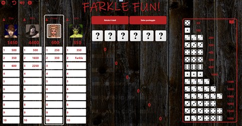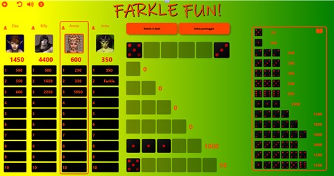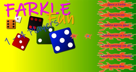 Le combinazioni di punteggio comuni sono mostrate nel gioco sul pannello di destra, ma ci sono troppe altre combinazioni di punteggio per mostrarle tutte. Se i rimanenti dadi lanciati non possono creare una combinazione di punteggio, la parola "Farkle" appare sullo schermo indicando che il giocatore ha FARKLED e rinuncia a tutti i punti per quel turno. Di tanto in tanto, il giocatore riesce a usare tutti e sei i dadi (in uno o più lanci). Quando ciò si verifica, è noto come "Hot Dice" e il giocatore può tirare di nuovo tutti e 6 i dadi, aumentando il punteggio. Se il giocatore fa uno di questi tiri bonus, tutti i punti per quel turno vengono persi. Quando il giocatore è soddisfatto del turno, salva il punteggio utilizzando il pulsante "Salva punteggio". Almeno 1 dado di valore deve essere selezionato dopo ogni tiro. Se il tiro non ha un valore significativo, potrebbe essere meglio selezionare solo 1 dado (preferibilmente un 1, ma anche un 5 funzionerà) e tirare di nuovo. Tieni d'occhio i punteggi. Se un giocatore è molto indietro e si sta avvicinando alla fine della partita, potrebbero essere necessari maggiori rischi per recuperare il ritardo. D'altra parte, se un giocatore è molto più avanti, potrebbe valere la pena di giocare sul sicuro e "Coast" attraverso i turni rimanenti non effettuando più di 1 tiro per turno. Per giocare contro il computer (solo versione Premium), vai nelle impostazioni e fai clic sulla casella di controllo accanto al giocatore che vorresti fosse il computer. Puoi effettivamente fare in modo che tutti e 4 i giocatori siano computer, se lo desideri. Quando si fa clic sulla casella di controllo, l'icona a destra dovrebbe cambiare da umano a robot, indicando che il computer ha preso il controllo di quel giocatore. Durante il gioco, accanto ai nomi vengono visualizzate icone di umani e robot, che indicano quali sono i giocatori del computer.