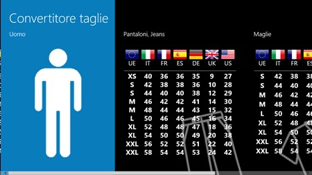 Permette di convertire le taglie dei vestiti, scarpe ecc per varie nazionalità