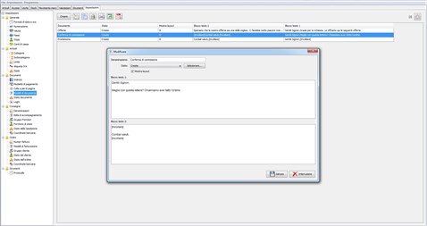 Come contenuto nella lista programmi per gli ordini è possibile aggiungere nei vostri ordini diverse denominazioni, date di consegna dati clienti, e gli articoli ordinati. Altri documenti cosi come preventivi e conferma di commissione si possono allegare tranquillamente. Anche per gli ordini selezionati può essere assegnato uno stato. Siete liberi di definire lo stato stesso, incluso nello stato del programma. Per ogni ordine, verrà emessa una fattura.
