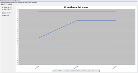 Il programma permette di effettuare diverse analisi e grafici statistiche, come ad esempio la quantità dei membri attivi o la somma dei pagamenti effettuati.
